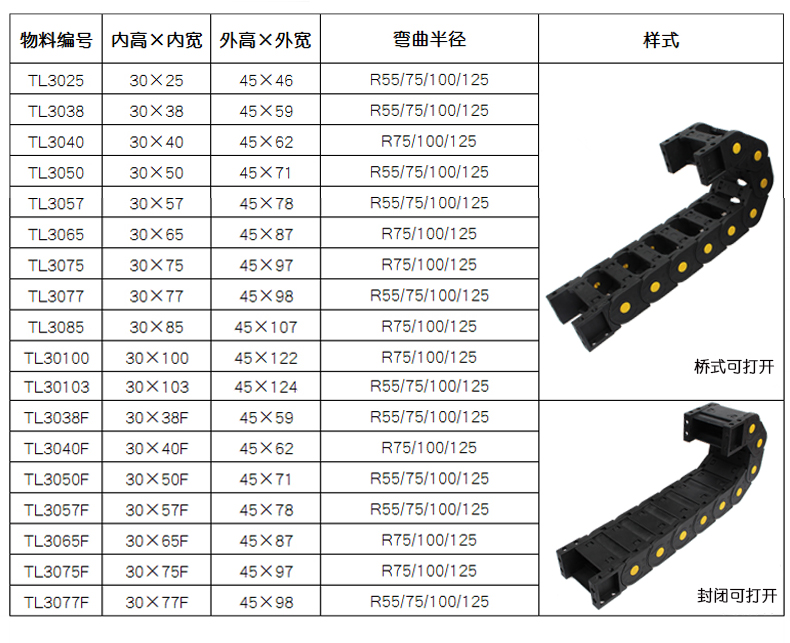 TL型塑料拖鏈規格是以內高x內寬定義的,單位為mm